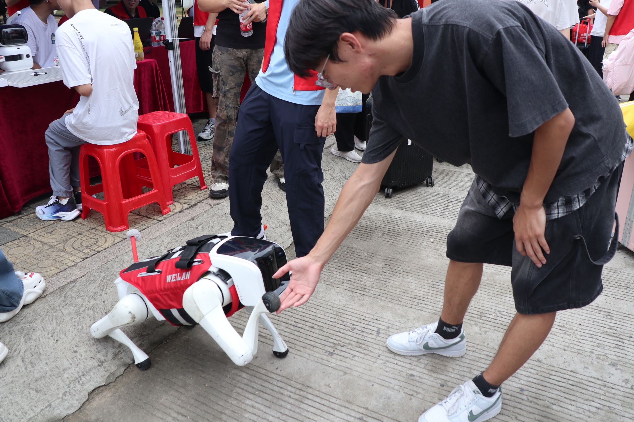 迎新活动现场,计算机学院为新生们营造了浓厚的科技氛围,学院自主研发的“AI职得”数字辅导员正式“履职”,以智能机器狗、“元萝卜”下棋机器人等科技产品为纽带,为新生开启了一场沉浸式的“科技初体验”。灵动的机器狗摇着机械手臂与新生握手互动,精准落子的“元萝卜”在棋盘上与新生展开智慧对弈,学院定制化打卡框里定格着一张张洋溢着好奇的青春笑脸,而AI辅导员则全程以温和的语音交互,将科技的趣味性与学院的专业特色悄然融入迎新环节。