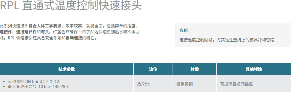 RPL系列凭借“直通式高效流道、双色精准标识、镀镍黄铜耐用材质、安全锁紧机制、模块化适配"五大核心技术特点,成为温度控制回路的优选连接方案。其设计聚焦温控场景的核心需求,既保障了流体传输的高效性与密封性,又通过便捷操作与精准识别提升了生产效率,同时兼顾耐用性与安全性,可稳定服务于注塑、电子等多个行业的温度控制系统。