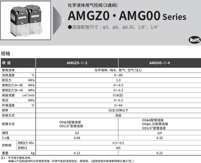备注:1.  上述参数为AMG※※系列通用核心参数,不同衍生型号(如AMG-Z、AMG-0子系列)因适配场景差异,部分参数可能存在细微调整,选型时需以对应型号的技术手册为准;2.  使用前务必确认阀体及密封件材质与所用流体的兼容性,避免因适配不当导致阀门损坏或介质污染;3.  超出上述参数范围的特殊工况,可联系CKD定制专属款型。